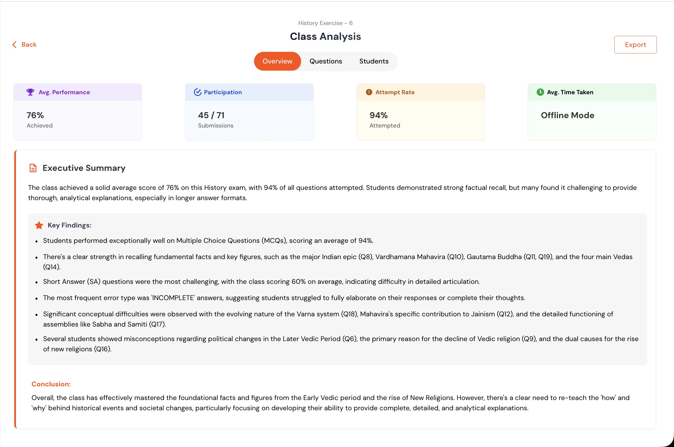 Class trends, student priority lists, topic weaknesses. Real-time visibility into learning.